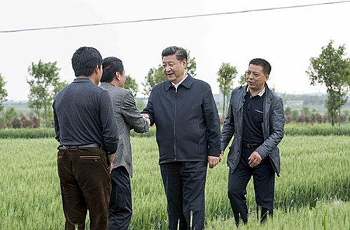 習(xí)近平在尉氏縣張市鎮(zhèn)高標(biāo)準(zhǔn)糧田察看小麥長勢。(圖片來源:新華視點(diǎn))