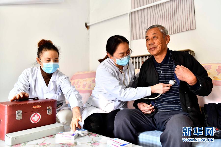 2020年11月11日,在山東省濰坊市寒亭區(qū)寒亭街道東院社區(qū),衛(wèi)生室醫(yī)生王紅霞(中)為村民張勇臣看病。寒亭區(qū)探索實施醫(yī)保服務(wù)下沉舉措,構(gòu)建起覆蓋全區(qū)基層醫(yī)療機(jī)構(gòu)的醫(yī)保服務(wù)下沉網(wǎng)絡(luò),讓群眾在家門口便捷地享受醫(yī)保紅利。新華社記者 郭緒雷 攝