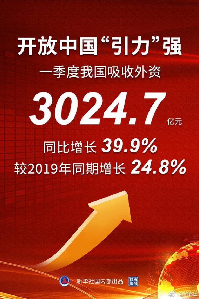商務(wù)部15日發(fā)布數(shù)據(jù)顯示,一季度,我國新設(shè)外商投資企業(yè)10263家,同比增長47.8%;實(shí)際使用外資金額3024.7億元,同比增長39.9%。