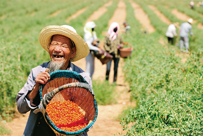 閩寧兩省區(qū)成功實(shí)現(xiàn)了援助式扶貧向開發(fā)式扶貧轉(zhuǎn)變。福建的人才、資金、技術(shù)、市場(chǎng)等要素與寧夏貧困地區(qū)的土地、特色農(nóng)產(chǎn)品和勞動(dòng)力資源有機(jī)結(jié)合,帶動(dòng)了當(dāng)?shù)噩F(xiàn)代農(nóng)業(yè)和特色優(yōu)勢(shì)產(chǎn)業(yè)的發(fā)展。一個(gè)個(gè)特色優(yōu)勢(shì)產(chǎn)業(yè)集群正在改變著西海固落后的生產(chǎn)結(jié)構(gòu)和傳統(tǒng)的生活方式。圖為寧夏同心縣農(nóng)民種植的枸杞喜獲豐收。 寧夏區(qū)委宣傳部供圖 李君杰/攝