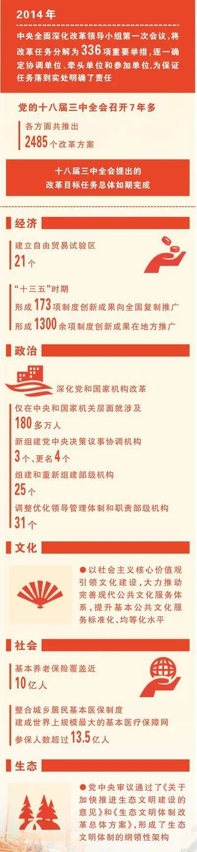 黨的十八屆三中全會—— 堅定不移高舉改革開放大旗(輝煌歷程) 2013年11月9日至12日,黨的十八屆三中全會在北京舉行。 全會聽取和討論了習近平總書記受中央政治局委托作的工作報告,審議通過了《中共中央關(guān)于全面深化改革若干重大問題的決定》。習近平總書記就《決定(討論稿)》向全會作了說明。 這是一份具有里程碑意義的宣言書,對中國走什么路、向何處去這個帶有方向性、戰(zhàn)略性的重大問題作出了旗幟鮮明的回答:高舉改革開放旗幟、努力開拓中國特色社會主義事業(yè)更加廣闊的前景。 這是一份具有劃時代意義的藍圖,對在新的歷史起點上全面深化改革作出戰(zhàn)略部署,在理論上有一系列重大創(chuàng)新,在實踐上有一系列重大突破,為實現(xiàn)中華民族偉大復興的中國夢,勾勒出改革路線圖和時間表。 新世紀新階段,改革開放航船,沿著黨的十一屆三中全會以來開辟的正確航道,又一次揚帆起航。 宏偉壯麗的改革事業(yè)到了關(guān)鍵時刻 看似尋常最奇崛,成如容易卻艱辛。 時間回溯到2013年金秋。 此時的中國,再次來到了事關(guān)前途命運的歷史關(guān)口。經(jīng)濟長期高速增長過程中積累的一系列深層次矛盾不斷積聚,舊的問題解決了,新的問題又產(chǎn)生,必須在更多領(lǐng)域、更深層次全面深化改革。 ——全面建成小康社會、加快推進社會主義現(xiàn)代化的宏偉藍圖,要求全面深化改革; ——堅持和發(fā)展中國特色社會主義,要求全面深化改革; ——解決中國發(fā)展面臨的一系列突出矛盾和挑戰(zhàn),實現(xiàn)經(jīng)濟社會持續(xù)健康發(fā)展,要求全面深化改革; ——順應時代潮流,滿足人民期待,保持黨和國家生機活力,要求全面深化改革…… 時代課題,擺在新一屆黨中央領(lǐng)導集體面前。 廣東、河北、甘肅、海南、天津、四川、湖北、遼寧、湖南……黨的十八大以來,習近平總書記調(diào)研的足跡遍及大江南北,遍及社區(qū)、鄉(xiāng)村、企業(yè)、學校。總書記以深邃的洞察力和高屋建瓴的戰(zhàn)略眼光,提出了全面深化改革需要調(diào)查研究的6個重大問題—— 進一步形成全國統(tǒng)一的市場體系,形成公平競爭的發(fā)展環(huán)境;進一步增強經(jīng)濟發(fā)展活力,為實現(xiàn)經(jīng)濟持續(xù)健康發(fā)展提供不竭動力;進一步提高宏觀調(diào)控水平,提高政府效率和效能;進一步增強社會發(fā)展活力,促進社會和諧穩(wěn)定;進一步實現(xiàn)社會公平正義,通過制度安排更好保障人民群眾各方面權(quán)益;進一步提高黨的領(lǐng)導水平和執(zhí)政能力,充分發(fā)揮黨總攬全局、協(xié)調(diào)各方的作用。 這6個重要課題,直指中國改革發(fā)展的關(guān)鍵。 1978年,黨的十一屆三中全會如平地驚雷,打破堅冰,開啟波瀾壯闊的改革開放航程。 2013年,宏偉壯麗的改革事業(yè)又一次到了關(guān)鍵時刻,決定著中華民族復興偉業(yè)的圓夢藍圖徐徐展開。 為謀定未來作出全面系統(tǒng)的戰(zhàn)略部署 2013年11月12日,中國再次吸引了世界關(guān)注的目光。 下午3時,黨的十八屆三中全會舉行閉幕會,出席全會的中央委員經(jīng)表決,一致通過了《中共中央關(guān)于全面深化改革若干重大問題的決定》。 當習近平總書記宣布《決定》通過時,會場上響起了熱烈的掌聲。 翻開這份決定,從以經(jīng)濟體制改革為主到全面深化經(jīng)濟、政治、文化、社會、生態(tài)文明體制和黨的建設(shè)制度改革,是新中國成立以來最為全面系統(tǒng)的改革部署。 “相比過去,新時代改革開放具有許多新的內(nèi)涵和特點,其中很重要的一點就是制度建設(shè)分量更重,改革更多面對的是深層次體制機制問題,對改革頂層設(shè)計的要求更高,對改革的系統(tǒng)性、整體性、協(xié)同性要求更強,相應地建章立制、構(gòu)建體系的任務更重?!绷暯娇倳涻r明指出新時代改革開放的特點。 十八屆三中全會把國家治理體系和治理能力建設(shè)擺到更加突出的位置,通過加強頂層設(shè)計、系統(tǒng)配套、整體推進,為謀定未來作出了全面系統(tǒng)的戰(zhàn)略部署。 ——《決定》明確了全面深化改革的總目標,體現(xiàn)了中國共產(chǎn)黨人的政治勇氣:完善和發(fā)展中國特色社會主義制度,推進國家治理體系和治理能力現(xiàn)代化。 ——《決定》指出了全面深化改革的目的,體現(xiàn)了中國共產(chǎn)黨人的必勝信心:進一步解放思想、解放和發(fā)展社會生產(chǎn)力、解放和增強社會活力。 ——《決定》部署了全面深化改革的重點,體現(xiàn)了中國共產(chǎn)黨人的堅強決心:必須以經(jīng)濟體制改革為重點、發(fā)揮經(jīng)濟體制改革牽引作用。 ——《決定》提出了全面深化改革的出發(fā)點和落腳點,體現(xiàn)了中國共產(chǎn)黨人的崇高理念:全面深化改革必須以促進社會公平正義、增進人民福祉為出發(fā)點和落腳點。 由此,中國改革開放跨入全新境界。 各方面軍迅速挺進全面深化改革主戰(zhàn)場 方向決定道路,道路決定命運。 ——黨的十八屆三中全會,彰顯的是中國共產(chǎn)黨人的寬廣眼界。習近平總書記指出,我們必須正確認識國際國內(nèi)形勢新變化,自覺適應實現(xiàn)全面建成小康社會目標新要求,把握住、利用好發(fā)展機遇,看得到、應對好風險挑戰(zhàn),以更加堅定的信