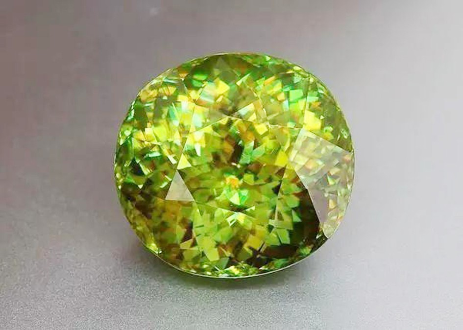 榍石是極稀少的寶石品種,折射率特別高,光澤特別強(qiáng),而且色散很高,它能把所接受的光束吸收成碎片形成光怪陸離的顏色。鉆石散發(fā)出的是七彩的閃光,榍石散發(fā)出的是五彩繽紛的強(qiáng)火彩,是一種耀眼的光彩,比鉆石更勝一籌。