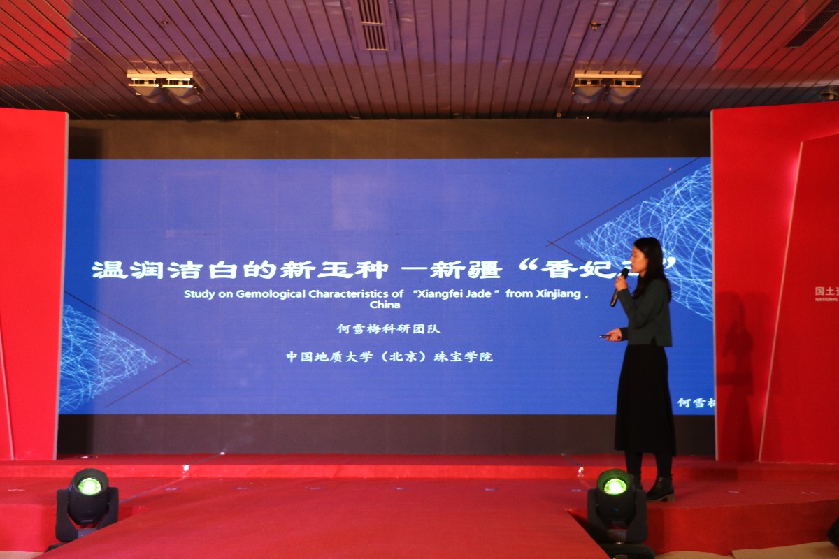 中國地質(zhì)大學(xué)(北京)珠寶學(xué)院何雪梅科研團(tuán)隊代表潘彥梅現(xiàn)場介紹香妃玉玉石的特點