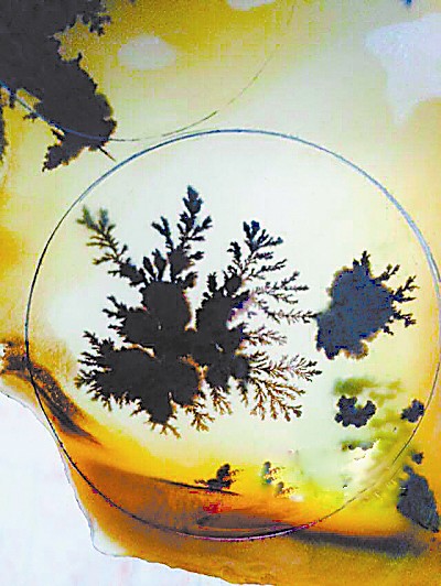 據(jù)龍陵縣黃龍玉協(xié)會(huì)會(huì)長(zhǎng)侯德升介紹,黃龍玉水草花并非真正的水草,而是由錳、鐵、鉻等致色礦物元素在黃龍玉玉料的形成過(guò)程中,逐漸浸透,滲入到玉料的裂隙之間,經(jīng)長(zhǎng)期沉淀、反復(fù)充填浸染而形成的千姿百態(tài)圖紋。