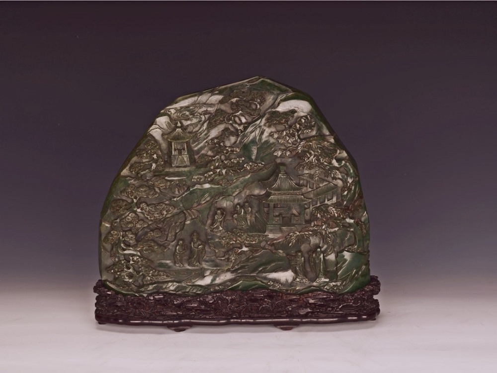 玉質(zhì)細膩,色澤沉靜清雅,布局周密詳實,雕刻細密精致。此器取玉石自然之形,正面雕琢仙山人物之景,古柏蒼松、亭臺樓閣、石階古道美不勝收,七位仙人或交談、或觀景、或休憩,超然物外;另一面雕刻自然景觀,山云霧林、仙鹿飛鶴、行云流水,讓人流連忘返。下面配有鏤雕著花卉、山石、靈芝仙草的檀木器座,營造出悠然自得、寄情山水的桃源仙境。