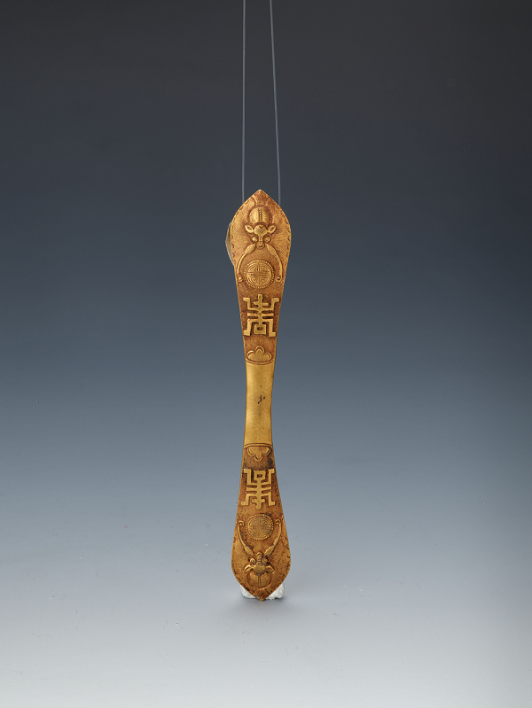 鏨刻福壽紋金發(fā)簪圈,清代,曲阜方家村出土,現(xiàn)藏于孔子博物館。發(fā)簪是古代男女常用的首飾,呈單股長(zhǎng)針狀。最初的用途是綰束頭發(fā)。古代制作簪子的材質(zhì)有金、銀、玉、銅、鐵等,充當(dāng)著男女情愛(ài)的信物和談婚論嫁的聘物。唐·杜甫《春望》詩(shī):“白頭搔更短,渾欲不勝簪?!?/p>