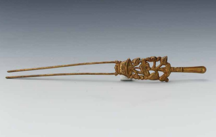 鏤空雕花卉紋鎏金銀發(fā)釵,清代,孔府舊藏。銀質(zhì)鎏金,由花凳、盆栽花卉、挖耳組成。簪、釵是古人用來(lái)固定和裝飾頭發(fā)的首飾,質(zhì)地為竹、角、金、銀、牙、玉等。簪為一股,發(fā)釵一般作兩股,普及大約在西漢晚期,此后,一直是我國(guó)婦女的主要頭飾之一。
