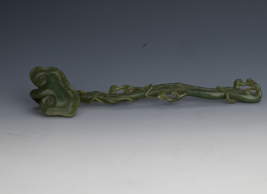 如意以碧玉雕成靈芝形,柄部鏤雕小芝、藤蔓,造型靈動,雕刻精美。