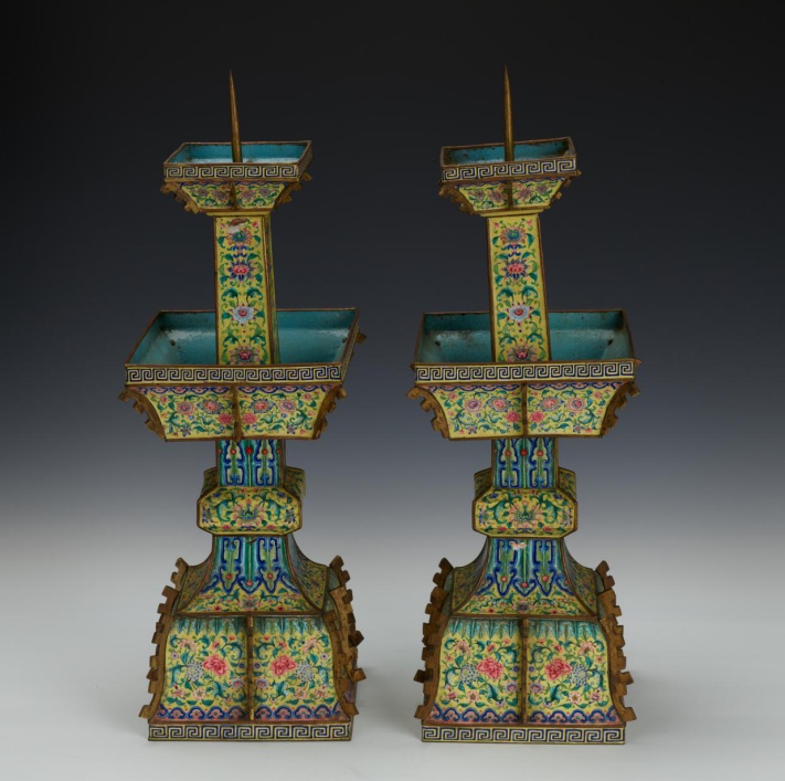 燭臺(tái)共兩件,形制相同。銅胎。由上下兩盤、承柱、方形高圈足組成,上盤內(nèi)有銅釬用以插燭,器身飾扉棱。盤內(nèi)壁施淺藍(lán)色琺瑯釉,外壁以黃色琺瑯釉為地,飾回紋、纏枝花卉紋、蕉葉紋、如意云頭紋等。