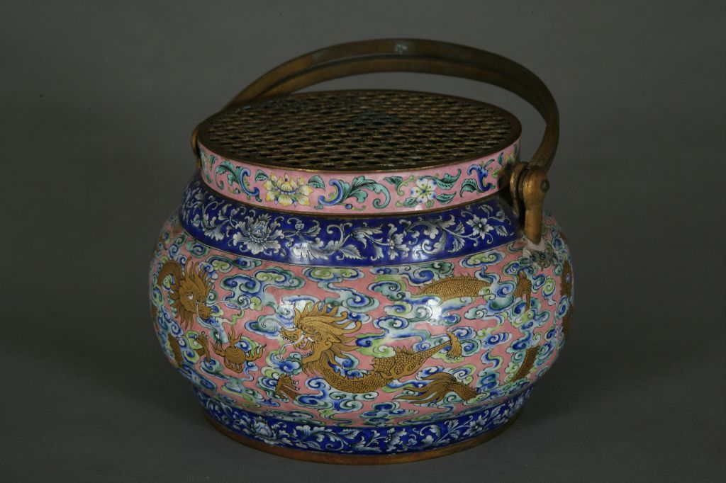 手爐圓形,上安設(shè)弧形提梁??谘貎?nèi)掛銅膽。蓋面以銅絲編結(jié)的密網(wǎng)做成,用以通風(fēng)換氣。器身中部以粉色為地,繪飾云龍戲珠紋,上下環(huán)以對(duì)稱的藍(lán)地白花裝飾帶。