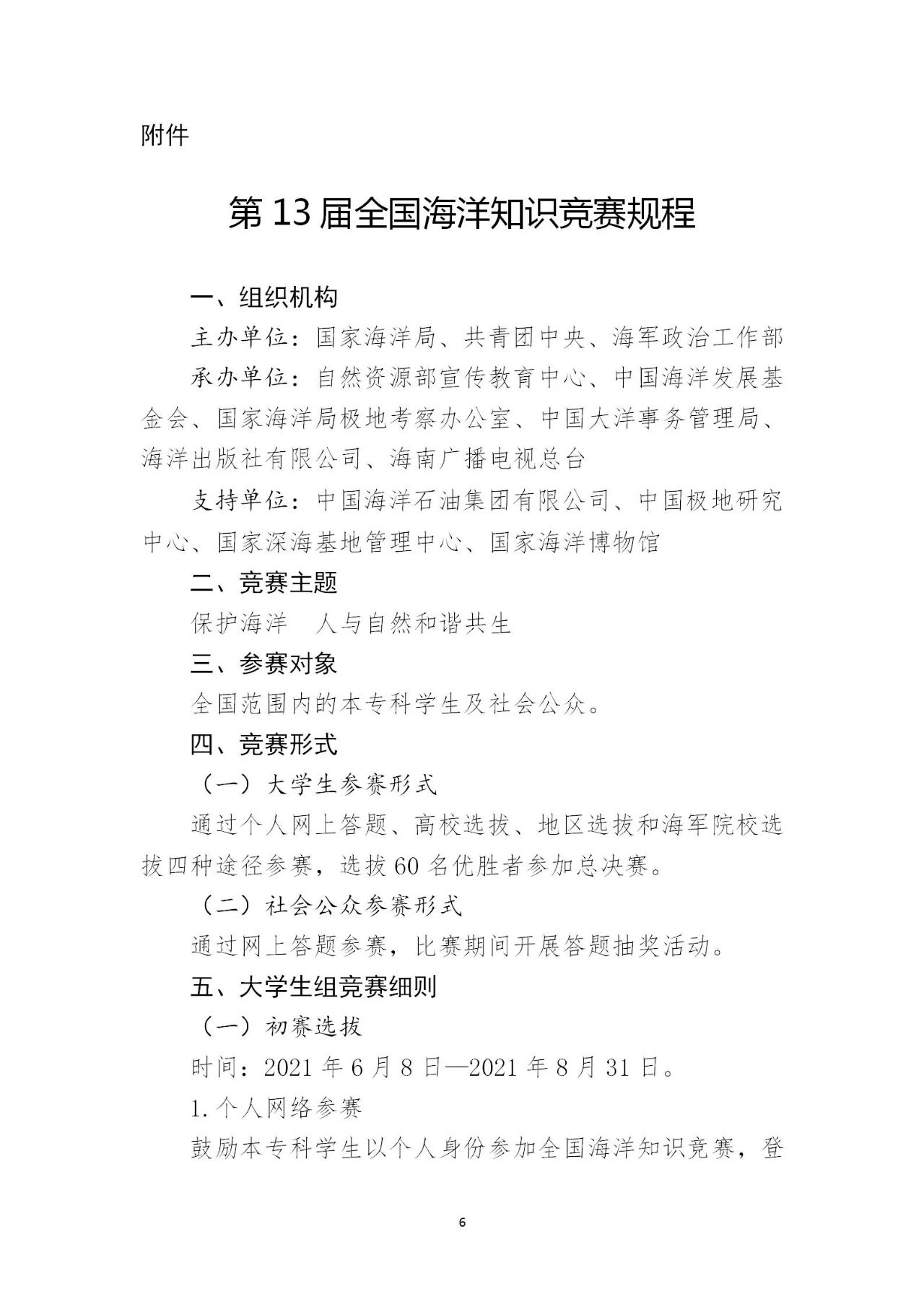 各省、自治區(qū)、直轄市及計(jì)劃單列市自然資源主管部門、團(tuán)委,新疆生產(chǎn)建設(shè)兵團(tuán)自然資源局、團(tuán)委,上海市海洋局、福建省海洋與漁業(yè)局、山東省海洋局、廣西壯族自治區(qū)海洋局、廈門市海洋發(fā)展局、青島市海洋發(fā)展局,各有關(guān)院校,自然資源部、共青團(tuán)中央、海軍所屬有關(guān)單位、機(jī)關(guān)有關(guān)司局: 為貫徹落實(shí)習(xí)近平總書記關(guān)于“進(jìn)一步關(guān)心海洋、認(rèn)識(shí)海洋、經(jīng)略海洋”的重要指示精神,深入推進(jìn)海洋強(qiáng)國建設(shè),引導(dǎo)社會(huì)公眾學(xué)習(xí)海洋知識(shí)、增強(qiáng)海洋意識(shí),牢固樹立“尊重自然、順應(yīng)自然、保護(hù)自然”生態(tài)文明理念,國家海洋局、共青團(tuán)中央、海軍政治工作部決定共同主辦第13屆全國海洋知識(shí)競(jìng)賽?,F(xiàn)將有關(guān)事項(xiàng)通知如下: 各單位要根據(jù)本地區(qū)疫情防控要求和實(shí)際情況,做好線上線下競(jìng)賽的組織發(fā)動(dòng),聯(lián)系各高校遴選優(yōu)秀選手參加全國大學(xué)生組總決賽,引導(dǎo)更多的大學(xué)生及社會(huì)公眾參加競(jìng)賽活動(dòng)。要充分借助電視、網(wǎng)絡(luò)、新媒體等各類宣傳平臺(tái),廣泛開展競(jìng)賽宣傳工作,擴(kuò)大競(jìng)賽活動(dòng)的社會(huì)影響,引導(dǎo)社會(huì)公眾關(guān)心海洋、認(rèn)識(shí)海洋,更好地利用海洋,促進(jìn)人與自然和諧共生。 自然資源部宣教中心 蔡紫南 010-63881303 共青團(tuán)中央青年發(fā)展部 蘭 彥 010-85212814 海軍政治工作部宣傳局 莫小亮 010-66960176自然資源辦公廳 共青團(tuán)中央辦公廳 海軍政治工作部宣傳局