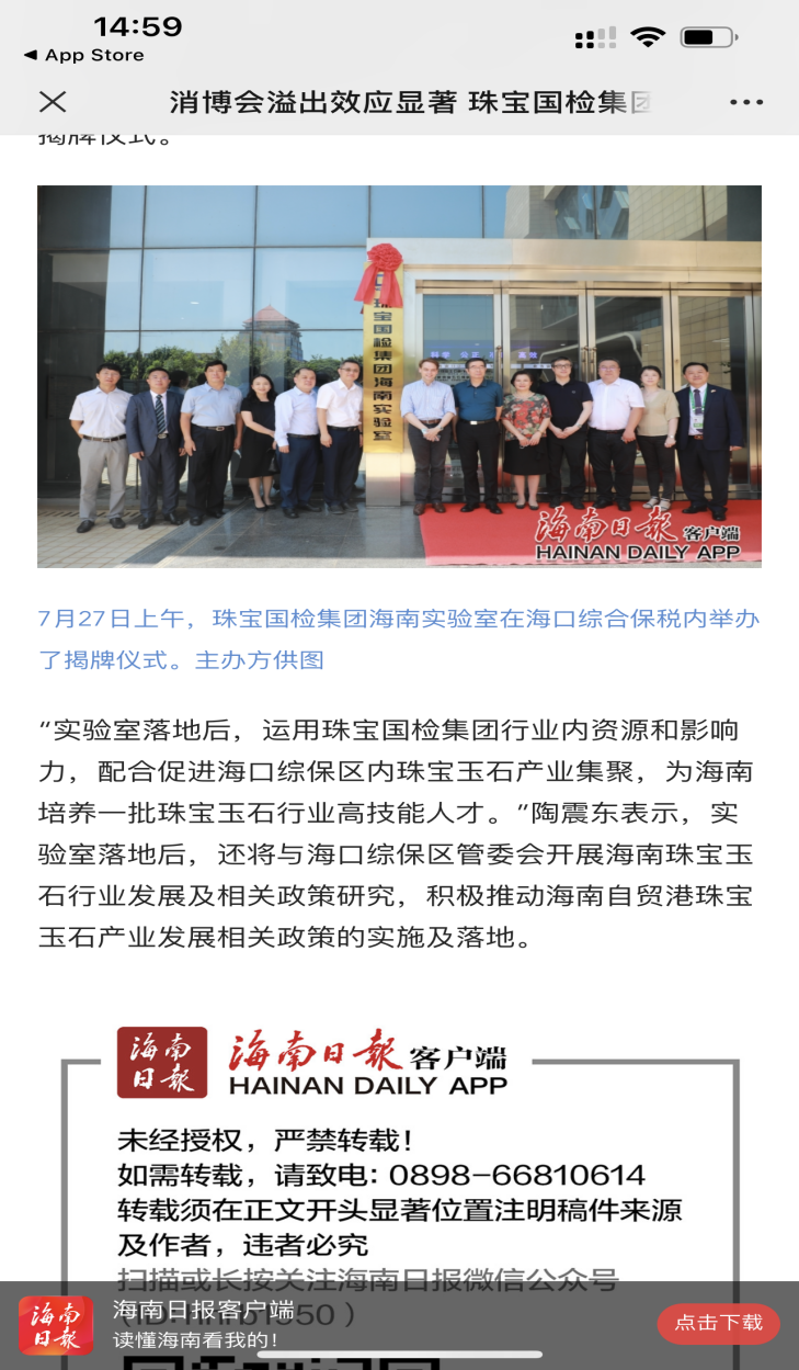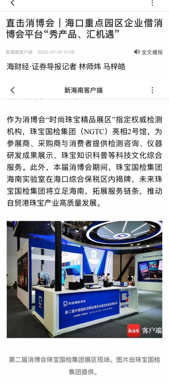7月25日-30日,珠寶國檢集團(tuán)受邀參加第二屆中國國際消費(fèi)品博覽會(huì)(下簡(jiǎn)稱消博會(huì)),作為權(quán)威的國家級(jí)珠寶檢測(cè)機(jī)構(gòu),珠寶國檢集團(tuán)為消博會(huì)提供的綜合科技服務(wù)得到參展商、采購商、消費(fèi)者的一致好評(píng);在消博會(huì)期間,珠寶國檢集團(tuán)受邀出席海口市招商引資推介會(huì)暨重點(diǎn)項(xiàng)目簽約儀式,珠寶國檢集團(tuán)海南實(shí)驗(yàn)室正式揭牌,以科技服務(wù)海南自貿(mào)港珠寶玉石產(chǎn)業(yè)發(fā)展。以上系列服務(wù)與舉措獲得海南電視臺(tái)新聞?lì)l道、海南日?qǐng)?bào)、海南日?qǐng)?bào)客戶端、??谌?qǐng)?bào)等媒體的關(guān)注與報(bào)道。