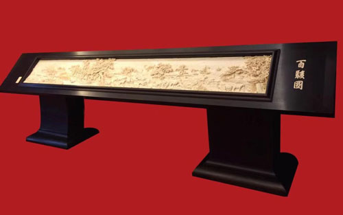 博覽會(huì)現(xiàn)場(chǎng)即將展示的大型牙雕作品《百駿圖》,是運(yùn)用平雕、透雕、精微雕、線雕等莆田傳統(tǒng)牙雕技法并按照清代宮廷畫家郎世寧《百駿圖》原畫作一比一進(jìn)行再創(chuàng)作的作品。百匹駿馬姿勢(shì)各異,或立、或奔、或跪、或臥,可謂曲盡駿馬之態(tài)。自2013年12月伊始,宋春國(guó)帶領(lǐng)團(tuán)隊(duì)夜以繼日,歷時(shí)近4年完成此作。(本作品總重量達(dá)500公斤,長(zhǎng)4.8米、高0.7米)。