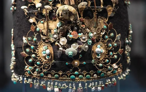 透過這件冠飾的細(xì)節(jié)可以發(fā)現(xiàn),珍珠均被綠松石、瑪瑙等貴重寶石托了起來,由此可見珍珠在當(dāng)時(shí)受重視的程度。人們發(fā)現(xiàn)珍珠不僅珍貴,還有著非常特殊的光澤,像天空中的星河與夜晚的星光,所以常用珍珠來形容女性的溫潤細(xì)膩、高貴典雅。