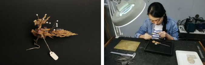 在修復(fù)時(shí),我發(fā)現(xiàn)一件特別神奇的事情,就是冠飾的鳳上都有用彈簧絲頂著的珍珠。當(dāng)把這組冠飾修復(fù)好后擺在那里,只要有人在這個(gè)空間里走動(dòng),彈簧上的珍珠就開始不停地顫動(dòng),有著非常強(qiáng)烈、自然的動(dòng)感。